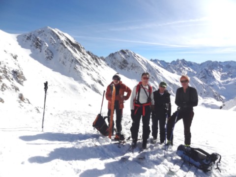 Passage au Pic de Barran puis au Pic du Mont et nouvelle descente face ouest. Là aussi alternance de bonne neige et de neige profonde humidifiée demandant un bon travail des cuissots.