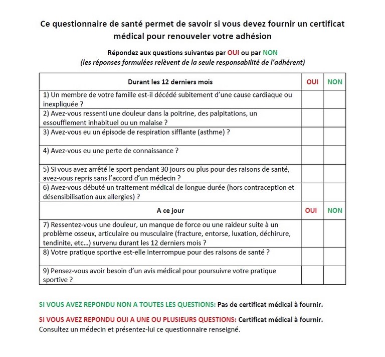 - si aucun certificat médical à fournir : vous devrez attester avoir répondu NON au questionnaire de santé dans le formulaire d’adhésion