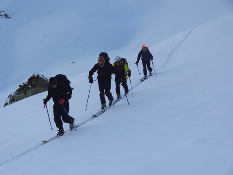 Aprés cette 1° descente en fait bien agréable, scéance repeautage puis il faut entamer la remontée. Il faut faire la trace dans une neige bien profonde. Heureusement il y a des bonnes jambes chez les MA.